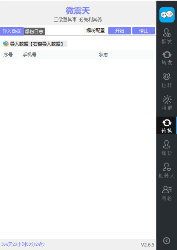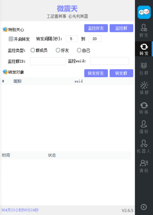 微震天10.0主打的群发功能,可发送文本、照片、视频、文档、链接、MP3、各种类型的内容,如小程序,支持群发,设置未发好友或群名单,提供立即群发、循环群发等多种模式。